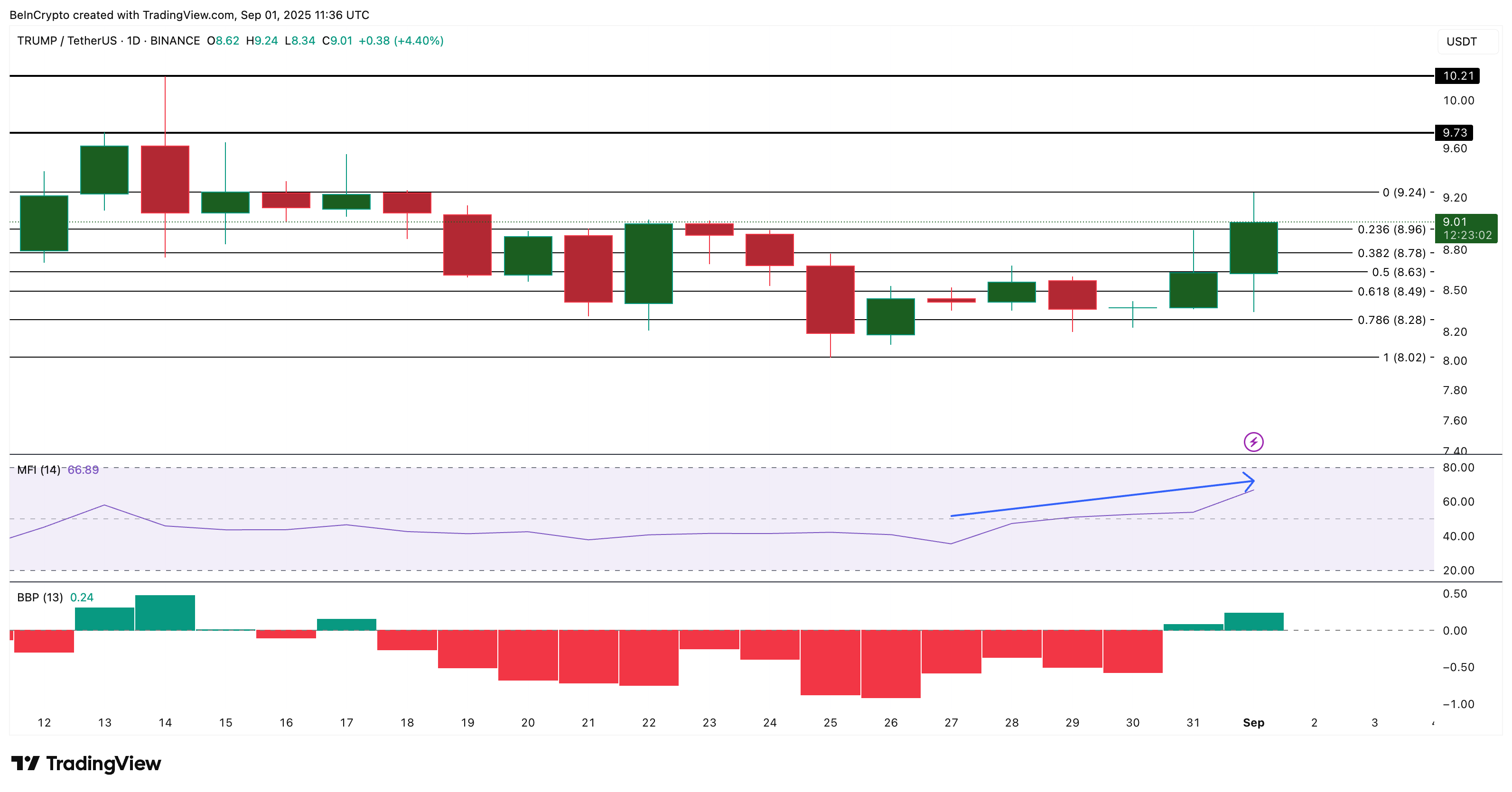 On-chain-mått bekräftar att köpare kliver in. Money Flow Index (MFI), som mäter både pris och volym för att spåra kapitalinflöden, har stigit när TRUMP klättrade från cirka 8 USD den 25 augusti till 9,07 USD. Detta pekar på aktiv ackumulering snarare än passivt innehav.