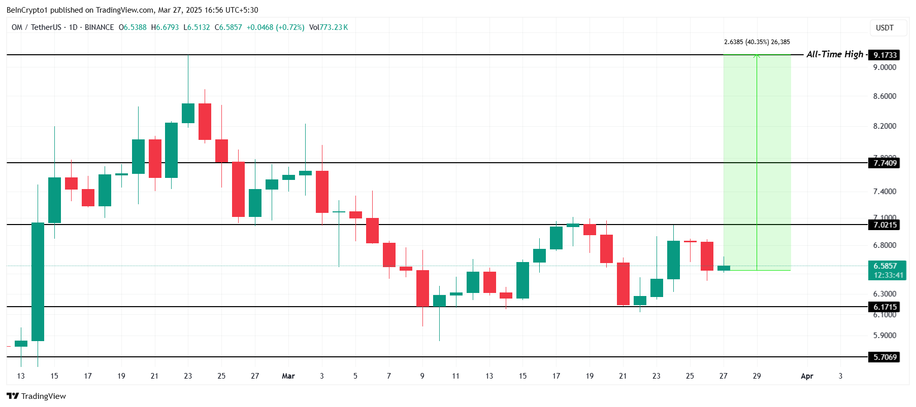 OM:s pris handlas för närvarande till 6,58 USD, fortfarande långt från sitt rekordhöga på 9,17 USD, vilket kräver en 40 % ökning för att nå den nivån. Trots detta har altcoinet betydande potential att stiga. En positiv förändring i marknadssentimentet kan driva det mot högre prisnivåer.