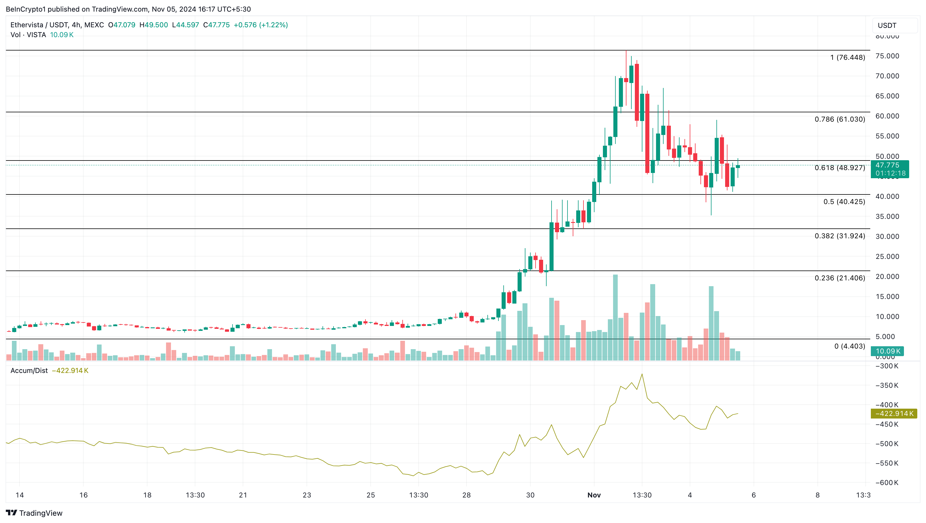 Under de senaste 24 timmarna har VISTA:s pris ökat med 15% och handlas nu till 47,86 USD. På 4-timmarsdiagrammet verkar altcoins uppleva en ökning i köptrycket, vilket indikeras av den nyligen stigande Ackumulering/Distribution (A/D)-linjen.