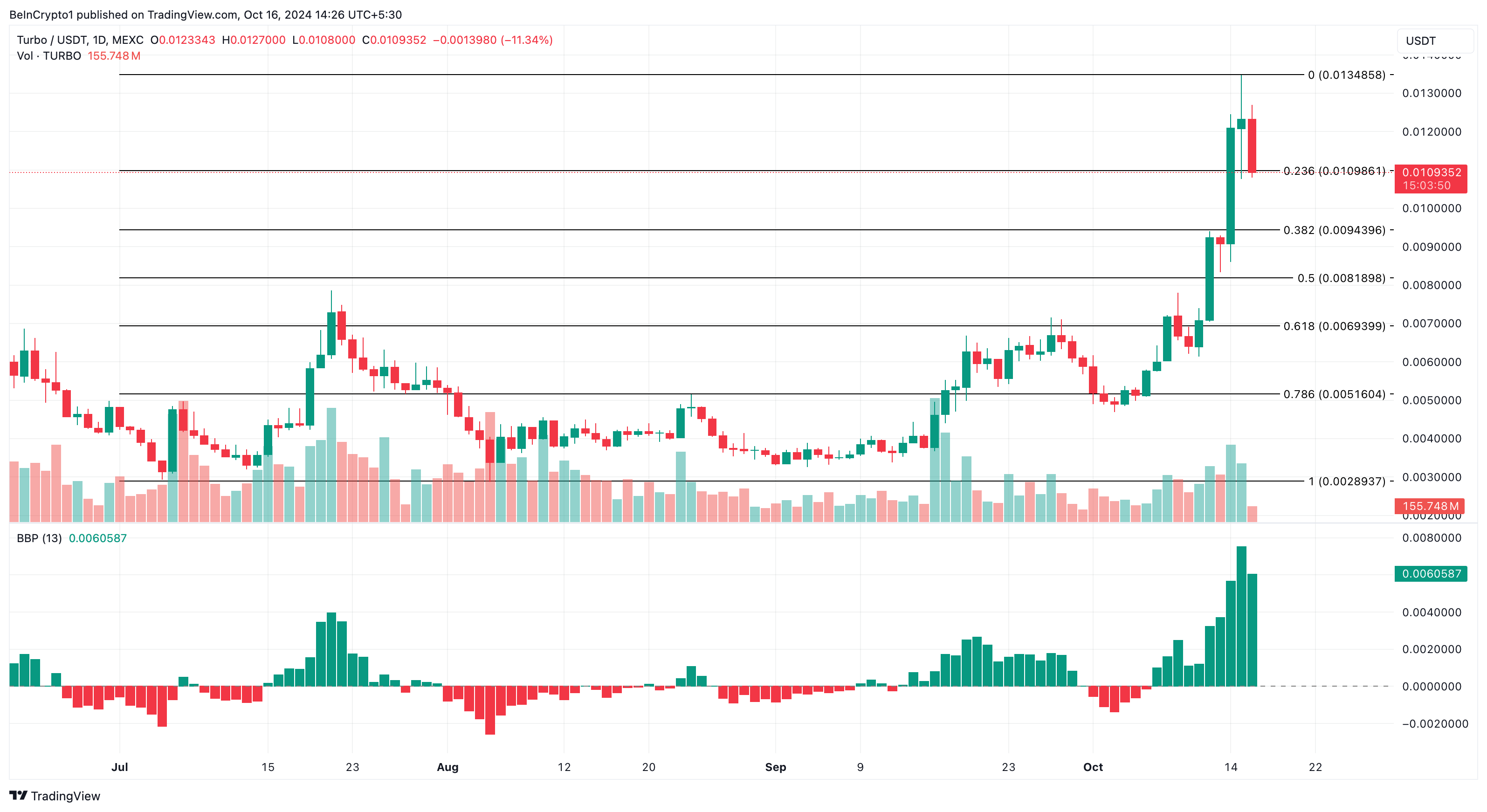 Om detta hålls kan TURBO:s pris klättra till 0,013 USD. Men om björnarna överväger tjurkraften kan denna förutsägelse bli ogiltig. Istället kan altcoinens pris sjunka till 0,0069 USD.