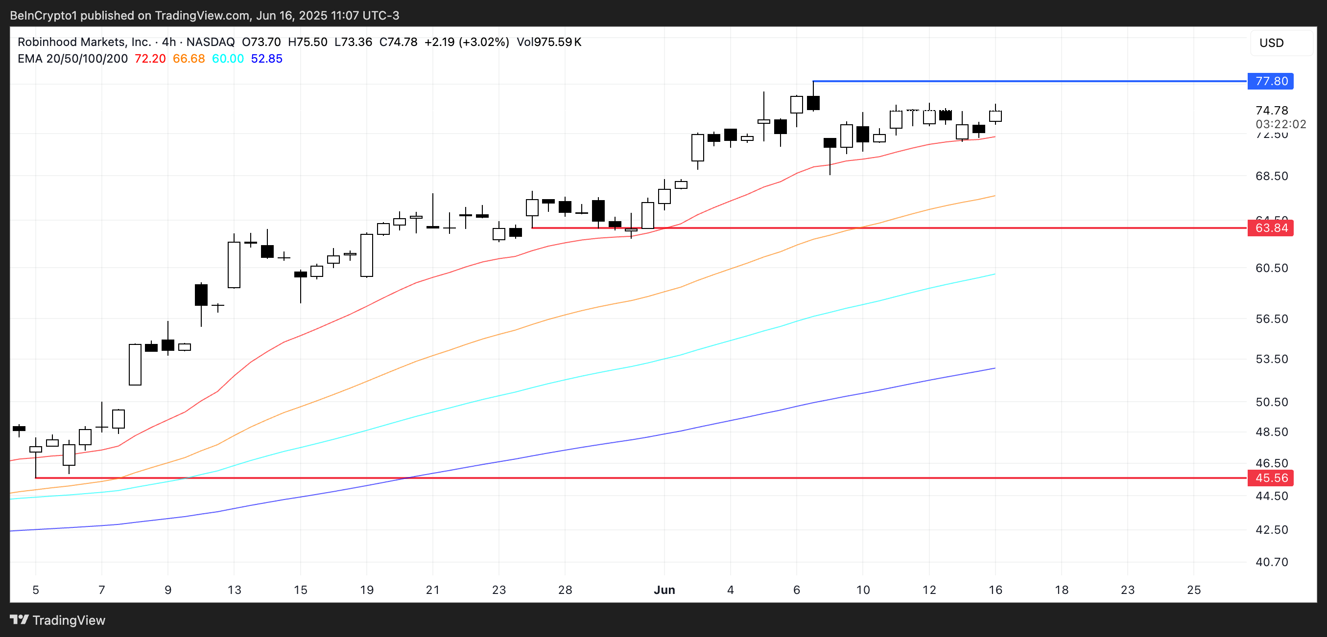 Om denna trend håller i sig, kan HOOD snart testa motståndet vid 77,8 USD, och ett genombrott över den nivån kan öppna vägen mot 80 USD, vilket markerar ett nytt rekordhögt värde och ytterligare bekräftar aktiens uppåtgående bana.