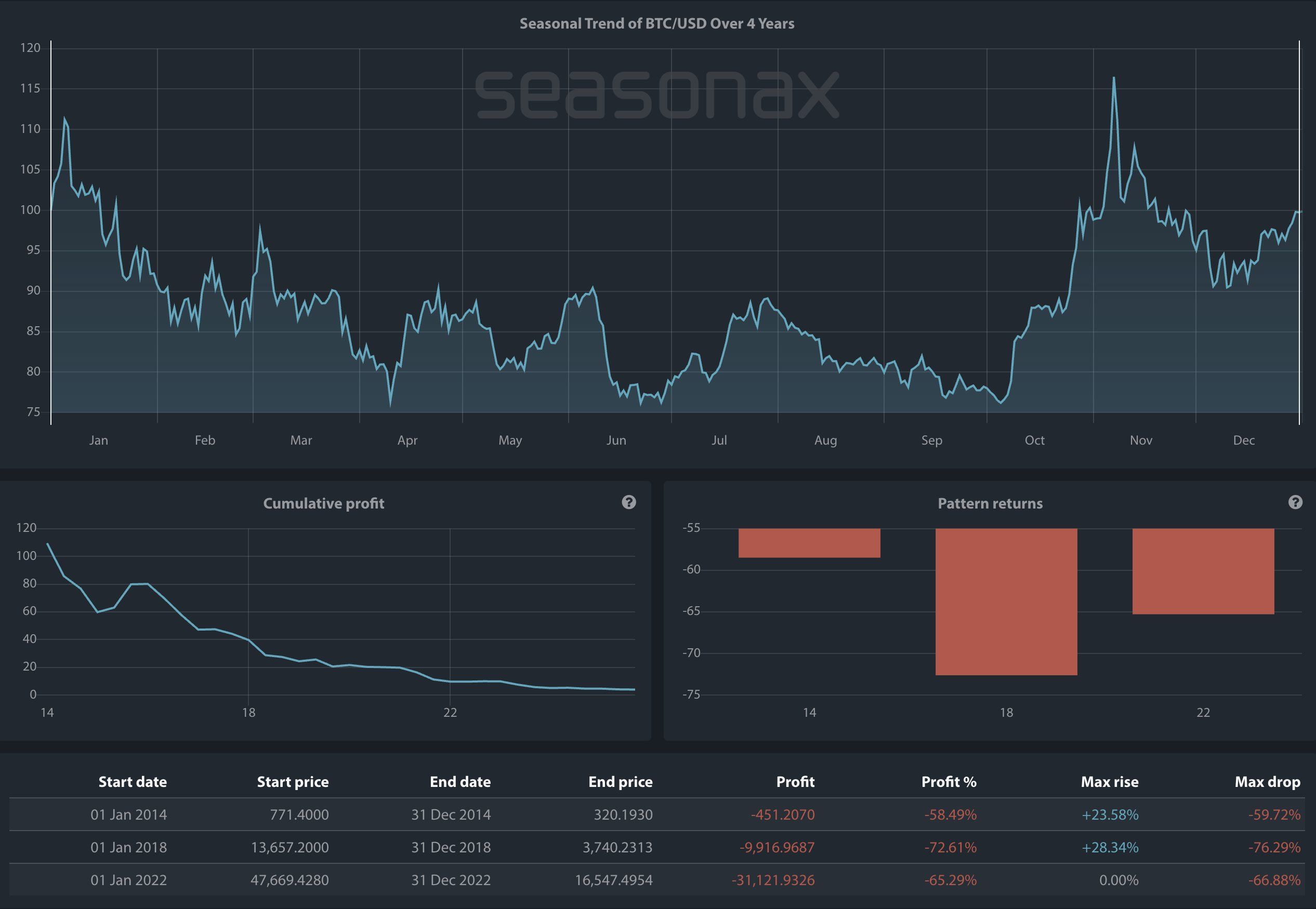 Historiska data från denna analytiker visar längden på tidigare bullcykler: 2010–2011 (~350 dagar); 2011–2013 (~746 dagar); 2015–2017 (~1 068 dagar); 2018–2021 (~1 061 dagar). Om historien upprepar sig förväntas den nuvarande cykeln vara cirka 1 060–1 100 dagar.
