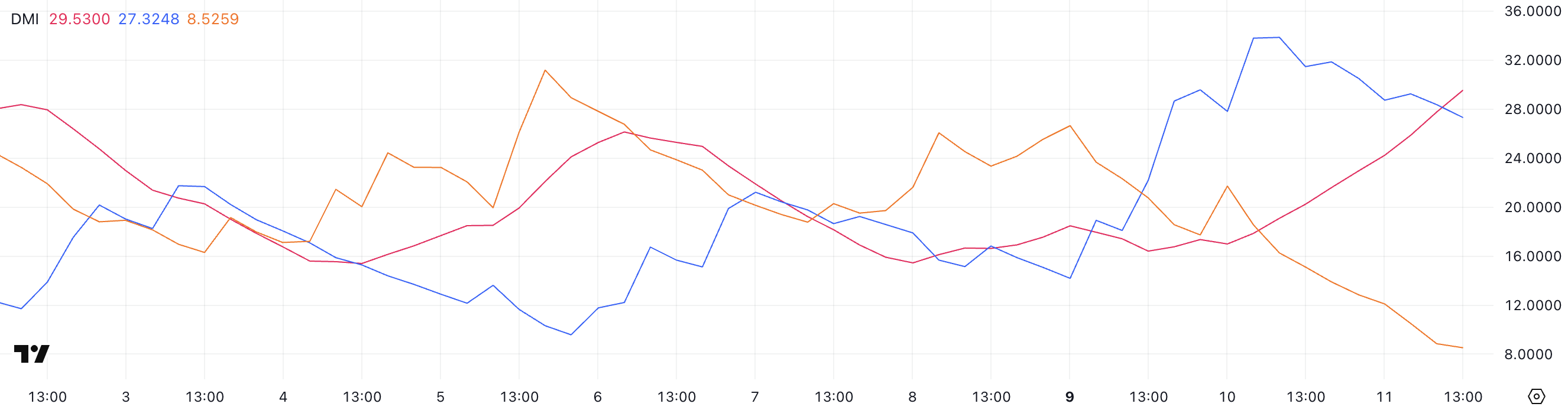 ADX mäter trendstyrka, med värden över 25 som vanligtvis indikerar en stark trend. Den stigande ADX antyder att momentum byggs upp, även när riktningselementen förändras.