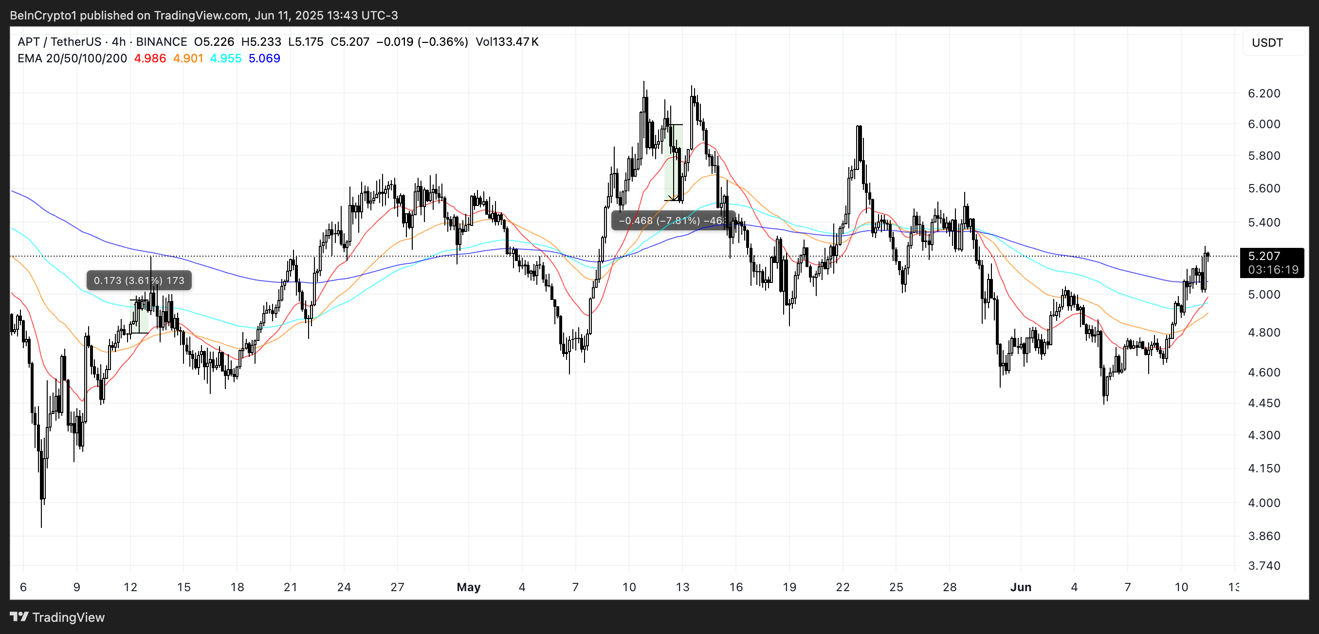 I så fall kan APT sjunka mot 4,83 USD-regionen, och om det baisseartade momentumet intensifieras kan en nedgång till 4,44 USD följa.