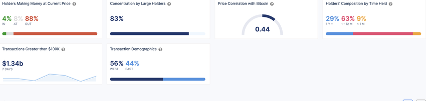 Data från IntoTheBlock visar att 88% av ARB-innehavarna förlorar pengar till det aktuella priset, medan endast 4% av de totala innehavarna gör vinster.