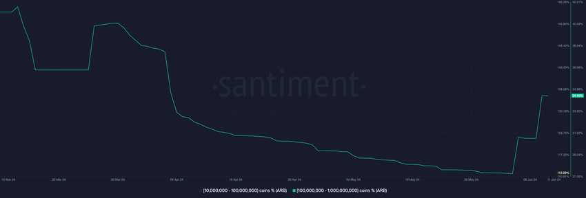 Enligt den analytiska plattformen Santiment på kedjan har adresser som innehar 100 miljoner till 1 miljard ARB-tokens ackumulerats mer sedan den 5 juni. Till exempel var utbudet av denna kohort 27,19% på ovannämnda datum.