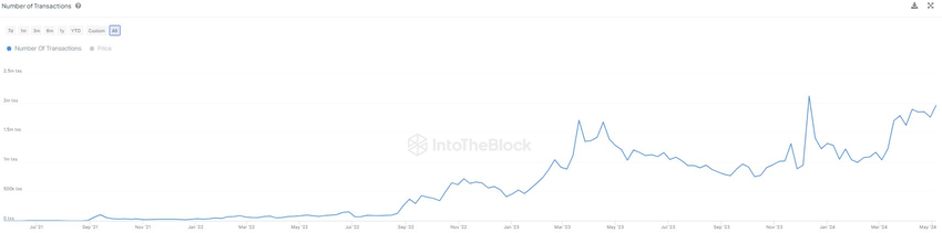 Det verkar dock som om nätverket får dragkraft, eftersom ny information från IntoTheBlock visar att antalet transaktioner på Arbitrum har börjat klättra tillbaka mot två miljoner dagliga transaktioner från och med igår.