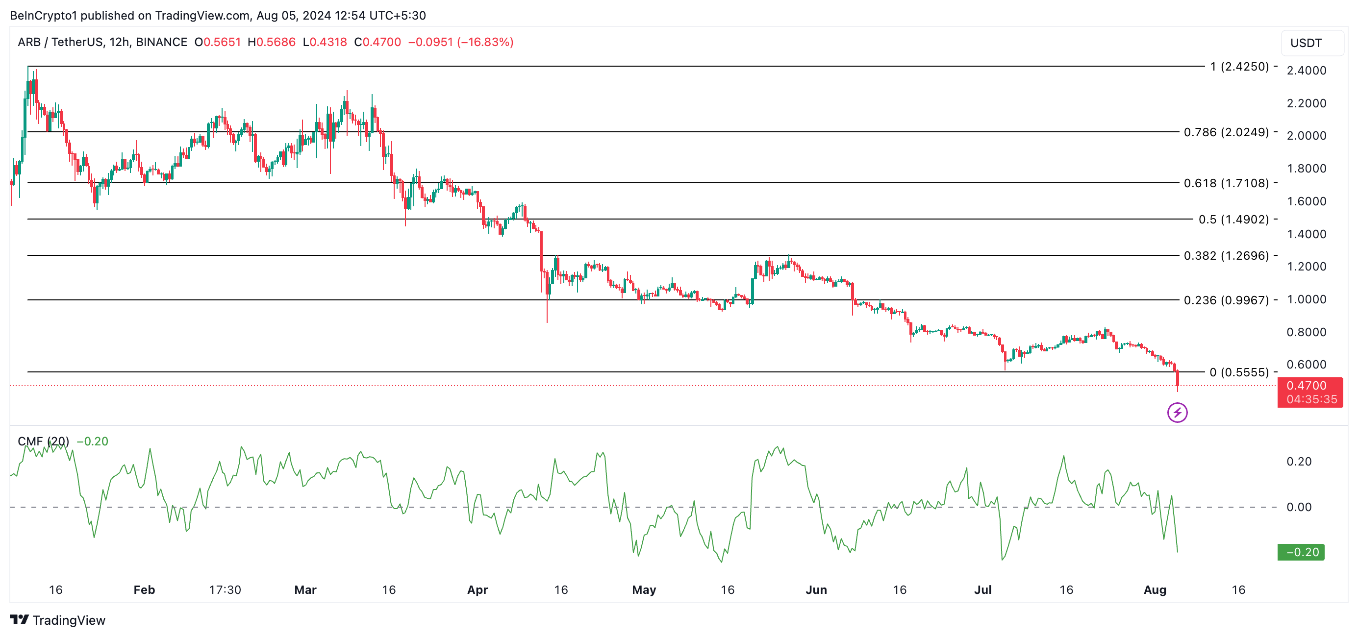 Enligt ARB:s Chaikin Money Flow (CMF), som mäter hur pengar flödar in och ut från sin marknad, är marknaden för närvarande svag. Under noll vid -0,20 signalerar tokens CMF en hög kapitalutgång. Detta är ett känt förstadium till en ytterligare prisnedgång.