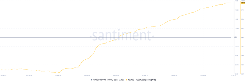 En on-chain-bedömning av ARB:s utbudsfördelning visar att antalet valadresser som innehåller mellan 10 000 och 10 000 000 tokens har trendat uppåt sedan den 1 april. Med 10 100 adresser när detta skrivs är denna kohort av ARB-valar den största sedan tokenen lanserades.