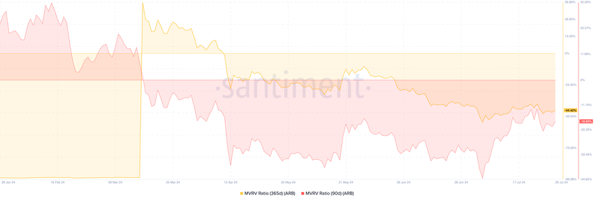 Avläsningar från tokens förhållande mellan marknadsvärde och realiserat värde (MVRV) bekräftar att ARB för närvarande är undervärderat. Tokens MVRV-förhållande är negativt när det bedöms över olika glidande medelvärden. Specifikt är ARB:s MVRV-förhållanden för 90-dagars och 365-dagars glidande medelvärden -18,63% respektive -42,42%.