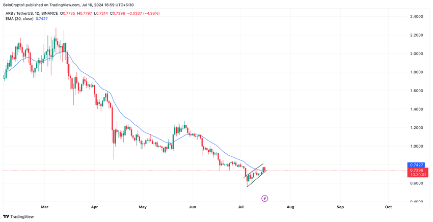 ARB har trendat inom denna kanal sedan den 4 juli och dess värde har ökat med 17%. Under måndagens handelssession stängde tokenen framgångsrikt över sitt 20-dagars exponentiella glidande medelvärde (EMA) för första gången sedan den 5 juni.