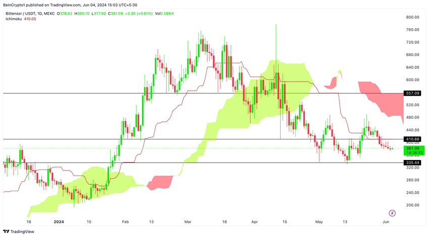 TAO upplevde en skarp korrigering, som fortfarande fortsätter. Fallet under 410 USD är en bearish signal eftersom 410 USD-linjen representerar en platt Ichimoku-baslinjeplatå.