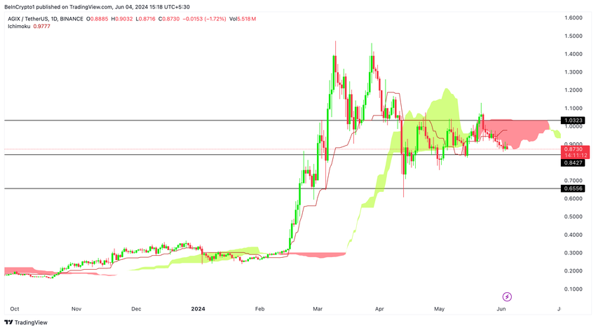 AGIX handlas för närvarande vid den nedre gränsen för det dagliga Ichimoku-molnet, vilket indikerar potentiell prisobeslutsamhet. Om priset sjunker under Ichimoku-molnet kan det signalera ett bearish momentum och pressa priset ner till 0,84 USD. Skulle priset bryta under stödnivån på 0,84 USD kan det sjunka ytterligare till 0,65 USD.