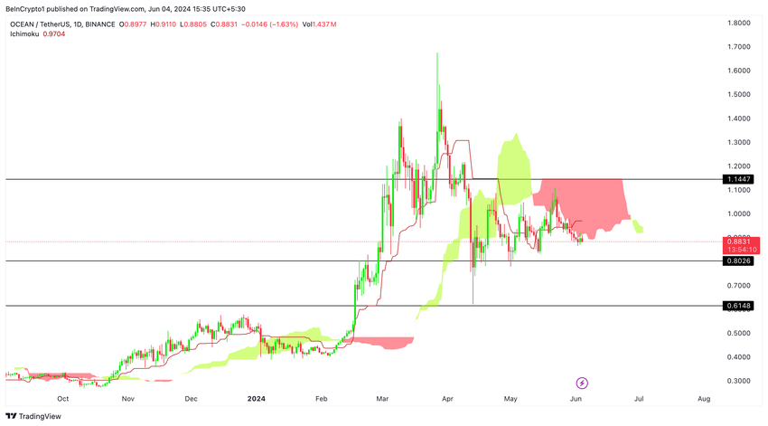 Oceans pris fick sig en törn under den senaste tidens Bitcoin-korrigering. När Bitcoin föll från 73 000 USD till 56 000 USD sjönk Ocean från 1,60 USD till 0,62 USD, vilket motsvarar en betydande minskning på 62%. För närvarande handlas Ocean till 0,88 dollar, precis vid botten av det dagliga Ichimoku-molnet.