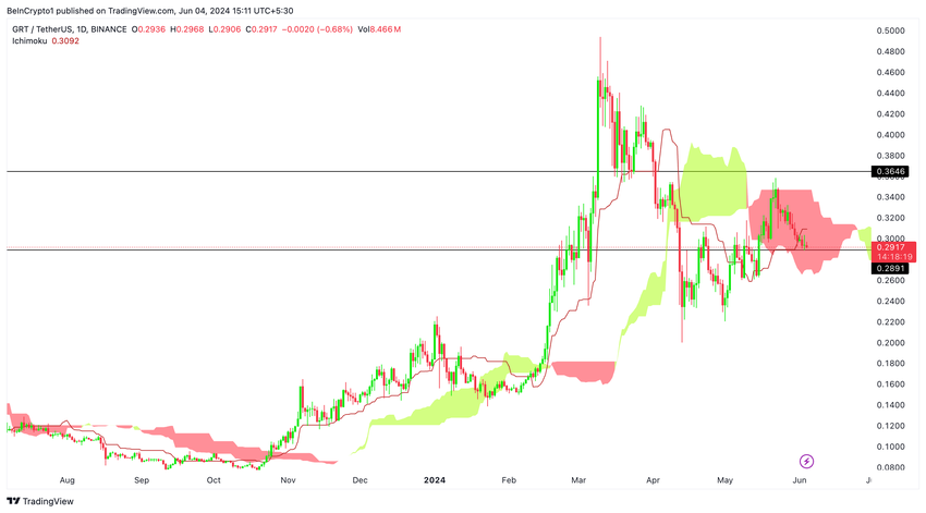 GRT har sjunkit 40% från sin lokala högsta nivå på 0,49 USD. Priset handlas för närvarande inom det dagliga Ichimoku-molnet, som sträcker sig mellan $ 0,26 och $ 0,34, en viktig zon att titta på.