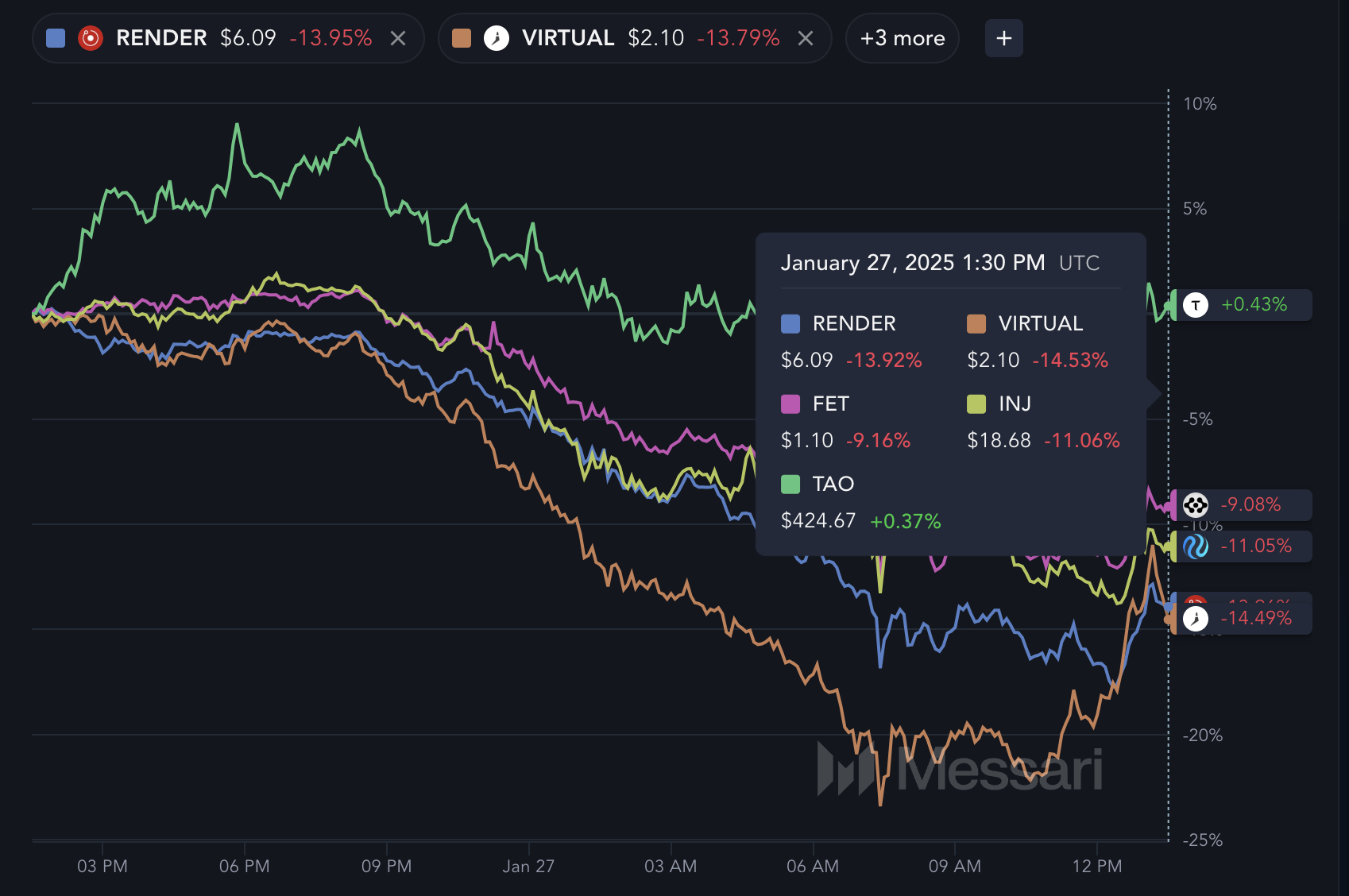 Denna utbredda nedgång visar den växande osäkerheten på AI-kryptomarknaden efter DeepSeeks störande framträdande.