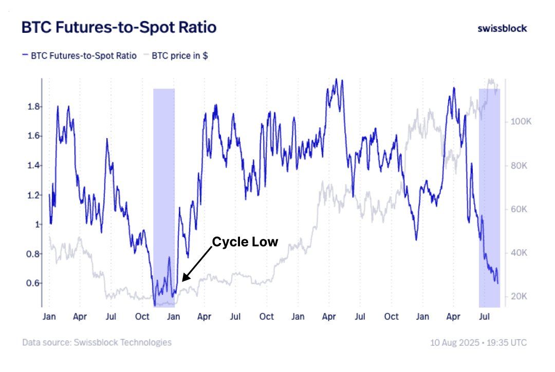 “Sedan april-lägsta har denna rörelse drivits av spot — massiva allokerare som köper upp varje sista BTC. Futures-till-spot-förhållandet är tillbaka till okt 2022-lägsta → en signal om episk spot-efterfrågan,” rapporterade Swissblock .