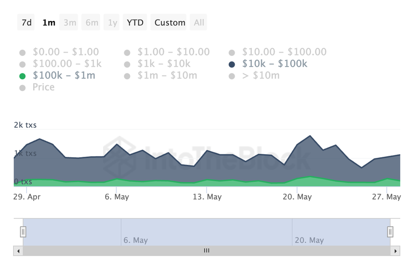 Under de senaste 30 dagarna har antalet AVAX-transaktioner värderade mellan $ 10,000 och $ 100,000 minskat med 26%. På samma sätt har transaktioner som sträcker sig från 100,000 dollar till 1 miljon dollar sett en minskning med 17% under samma tidsram.