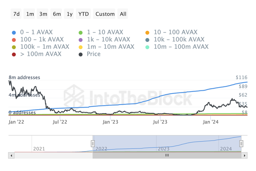 I skrivande stund är mer än 2 miljoner små AVAX-innehavare på break-even eller i förluster. Denna situation kan öka säljtrycket eftersom dessa investerare kan besluta att sälja för att minska sina förluster, vilket ytterligare driver priset nedåt.