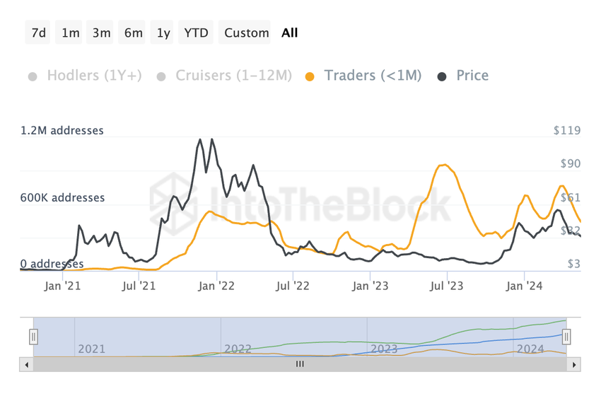 Minskningen i innehavstiden återspeglar ett baisseartat marknadssentiment. Investerare är mindre säkra på AVAX långsiktiga potential och väljer att handla in och ut ur positioner oftare.