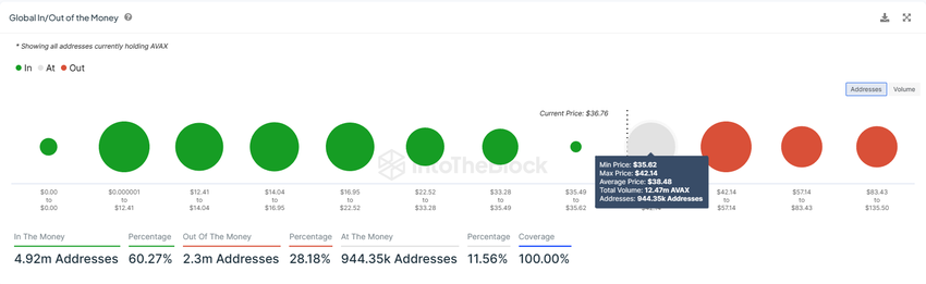 För det andra kommer Avalanches pris att möta betydande motstånd på grund av en massiv efterfrågebarriär. Enligt Global In/Out of the Money-indikatorn (GIOM) väntar cirka 12,47 miljoner AVAX vinster. Denna leverans köptes till ett genomsnittligt pris på $ 38, vilket gör det värt över 473 miljoner dollar.