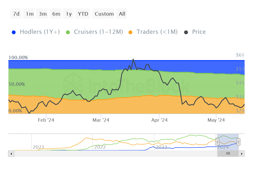 Detta gör deras innehav mottagliga för försäljning. När det gäller AVAX är nästan 28% av all cirkulerande AVAX i deras händer. Fyrtio procent av AVAX innehas fortfarande av medelsiktiga investerare som innehar sina tillgångar i över en månad och mindre än ett år.