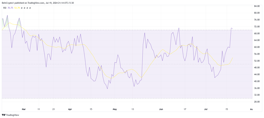 Den senaste hausseartade trenden ledde också till att Telegram-myntet blev överköpt, vilket indikeras av Relative Strength Index (RSI). Det hausseartade momentumet mättades inom en dag, vilket signalerar en potentiell kortsiktig korrigering.