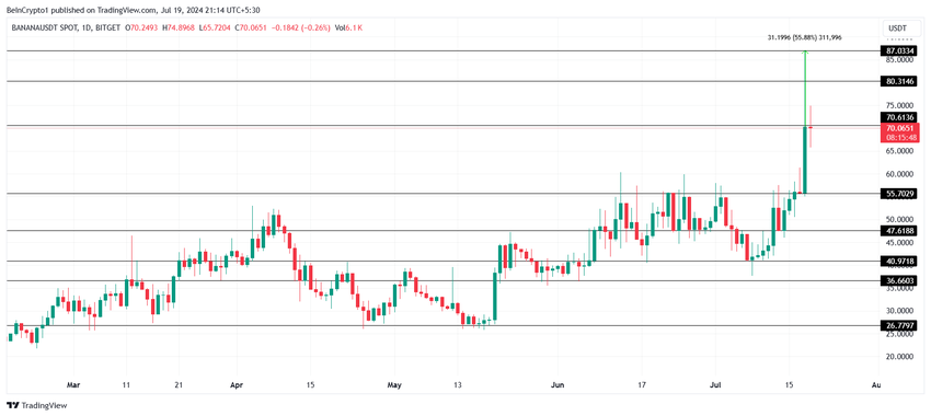 När tillgångens hausse mättas och inflödena minskar kommer det troliga resultatet att bli en nedgång till $65,00 eller lägre. Detta skulle utplåna en del av den senaste ökningen om inte BANANA ser hög efterfrågan efter sin notering på Binance den 20 juli.