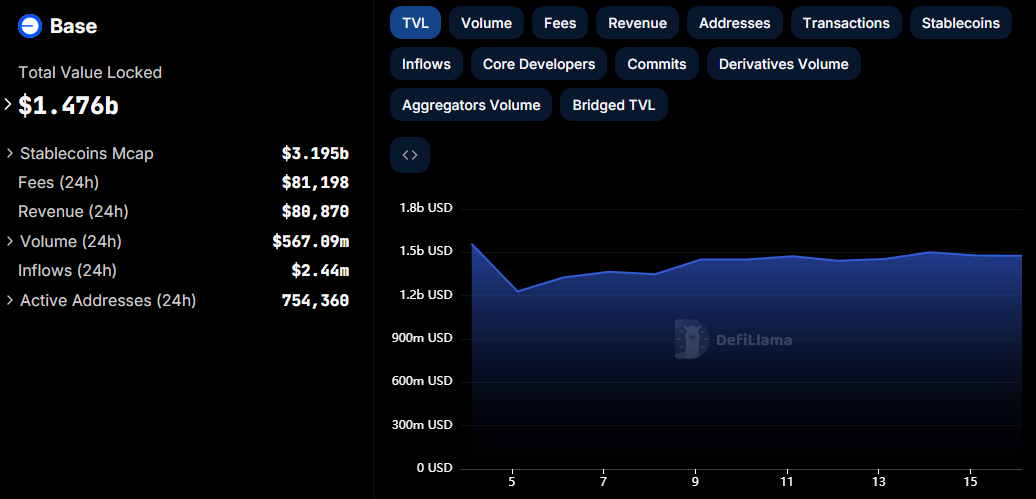 Base har sett en ökning på 19,7% i totalt låst värde (TVL) sedan den 5 augusti, från 1 229 miljoner USD till 1 472 miljoner USD den 16 augusti. Denna kraftiga ökning indikerar ökad användardeltagande och växande intresse för plattformen.