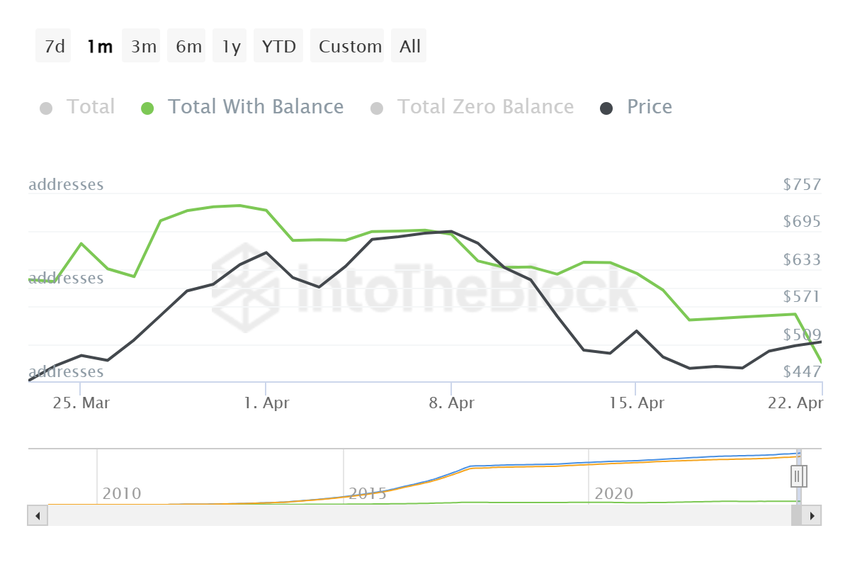Detta beror på att altcoin, efter rallyt i mars, var på grund av en korrigering när marknaden svalnade. Följaktligen väljer investerare att investera i tillgången över att bära förluster. Detta ledde till att de totala adresserna föll från 25,16 miljoner till 24,77 miljoner.