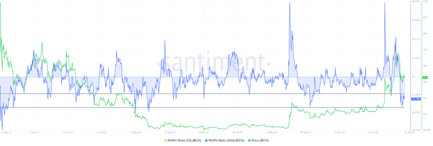 MVRV-förhållandet övervakar investerarnas vinster och förluster. Med Bitcoin Cashs 30-dagars MVRV på -17%, vilket indikerar förluster, kan ackumulering följa. Historiskt sett bevittnar BCH återhämtning på MVRV-nivåer på -14% till -24%, vilket markerar det som en zon för ackumuleringsmöjligheter.
