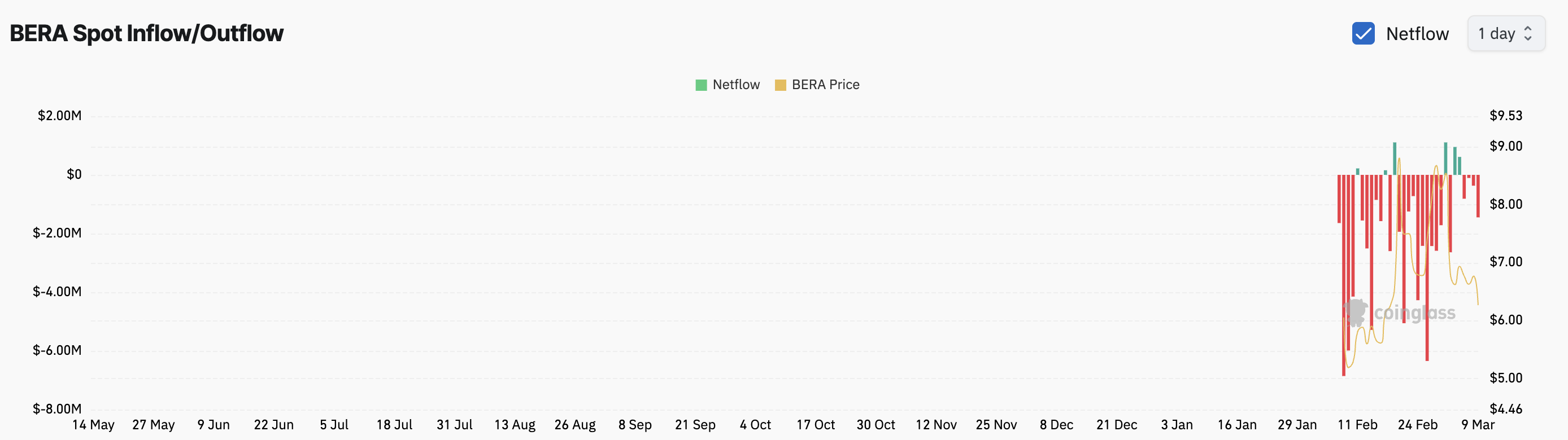 BERA har också noterat betydande utflöden från sina spotmarknader de senaste dagarna. Enligt Coinglass har altcoinet noterat nästan 2 miljoner USD i spotmarknadsutflöden bara idag.