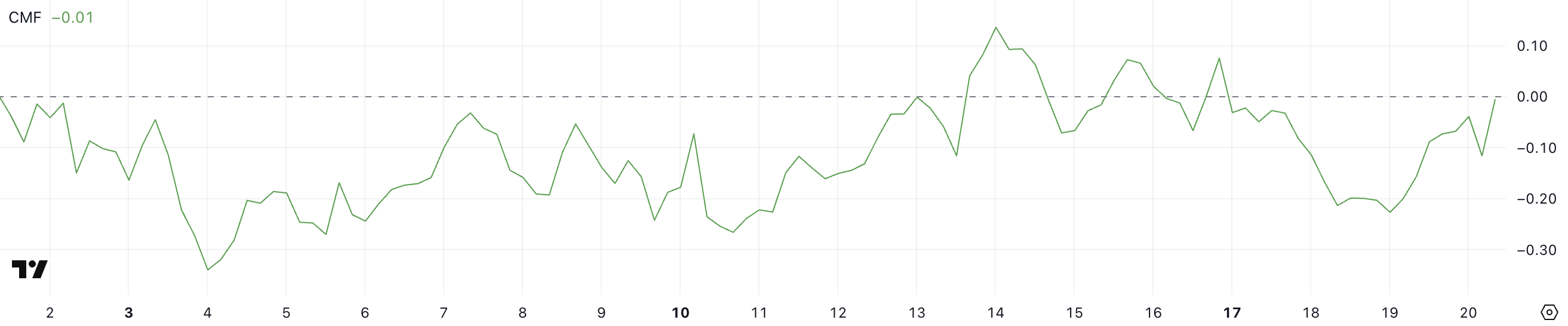 Trots denna lilla återhämtning ligger CMF fortfarande i negativt territorium, vilket tyder på att marknaden ännu inte ser starka kapitalinflöden.