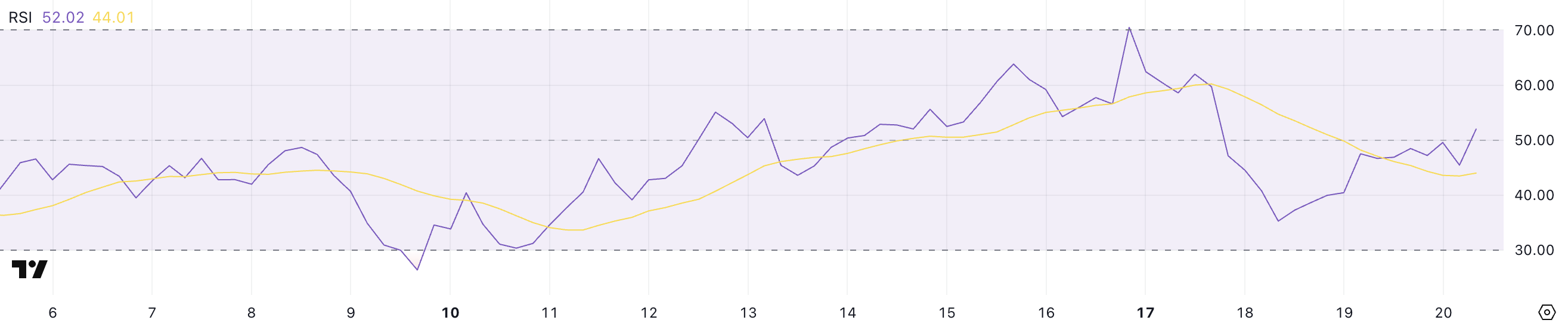 Uppgången över 50 tyder på att uppåtgående momentum börjar återfå viss kontroll efter den senaste korrigeringen, även om marknaden förblir relativt balanserad mellan köpare och säljare för tillfället.
