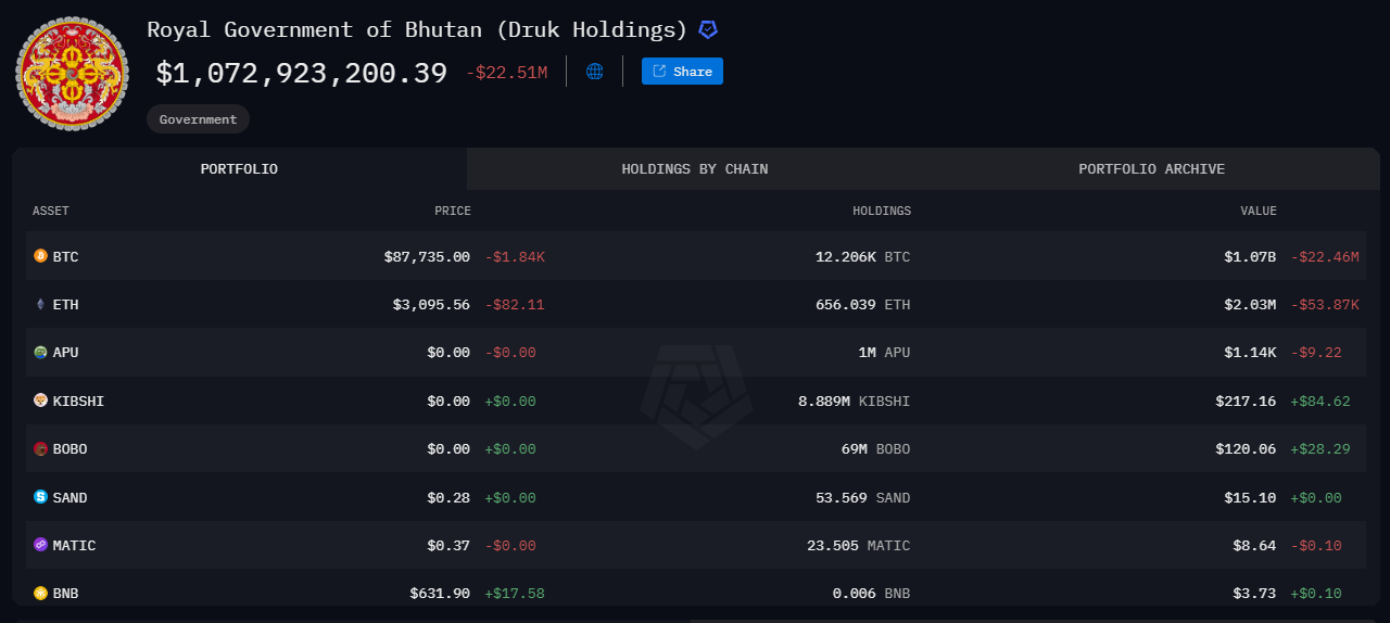 Arkham data visar att Bhutan fortfarande innehar 12 206 Bitcoin, för närvarande värda nästan 1,11 miljarder USD. Dessa tillgångar hanteras av Druk Holding & Investments. Regeringen verkar utnyttja prisökningar genom att sälja delar av sina innehav under marknadsuppgångar.