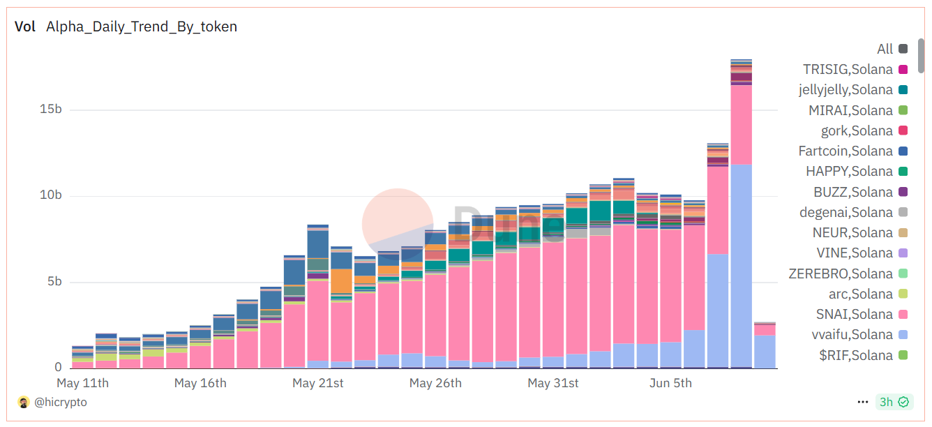 Men alla är inte pessimistiska. On-chain-data från Dune Analytics visar en annan bild. Handelsvolymen för Binance Alpha-tokens fortsätter att växa och har till och med nått all-time highs, över 17 miljarder USD.