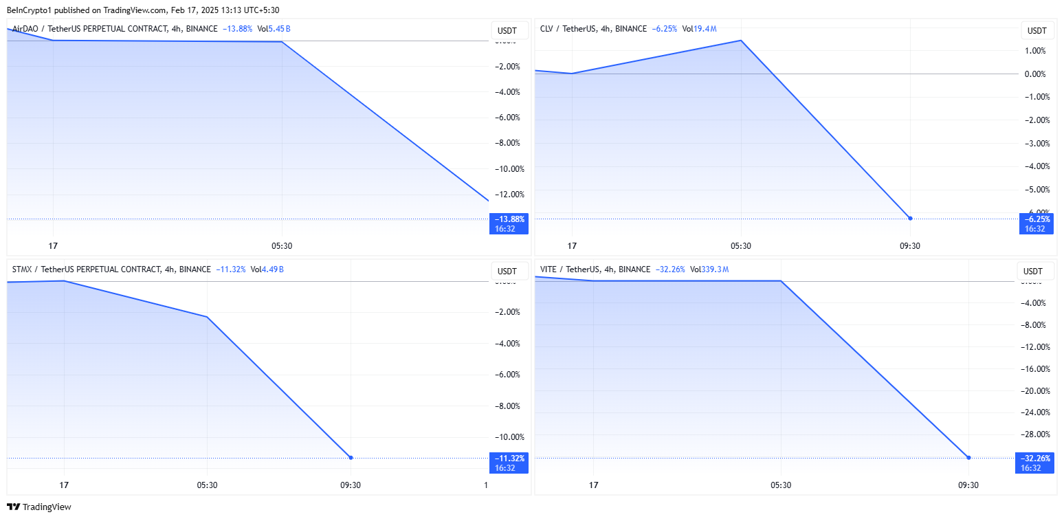 “…vi har beslutat att ta bort och upphöra med handel på alla spot-handelspar för följande token den 2025-02-24 03:00 (UTC): AirDAO (AMB), CLV (CLV), StormX (STMX) och VITE (VITE),” sa Binance här.
