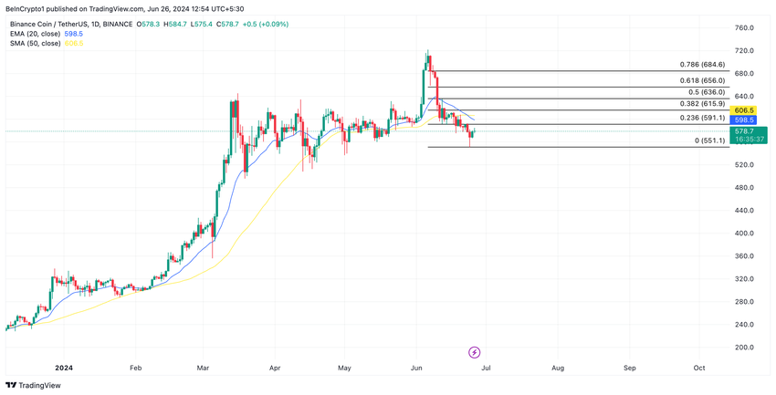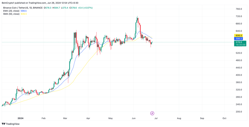 Binance Coin (BNB) har bibehållit en nedåtgående trend sedan den föll från sin rekordnivå på $720,67 den 6 juni. Altcoinet bytte ägare för $576,22 vid presstillfället och har sedan dess rasat med 24%.