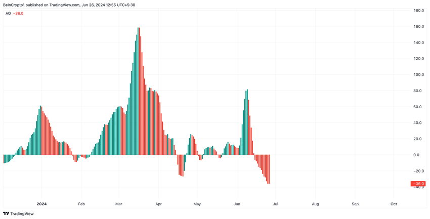 Avläsningar från BNB:s Awesome Oscillator (AO) bekräftar möjligheten att detta händer. Sedan den 10 juni har indikatorn endast returnerat röda histogramstaplar.