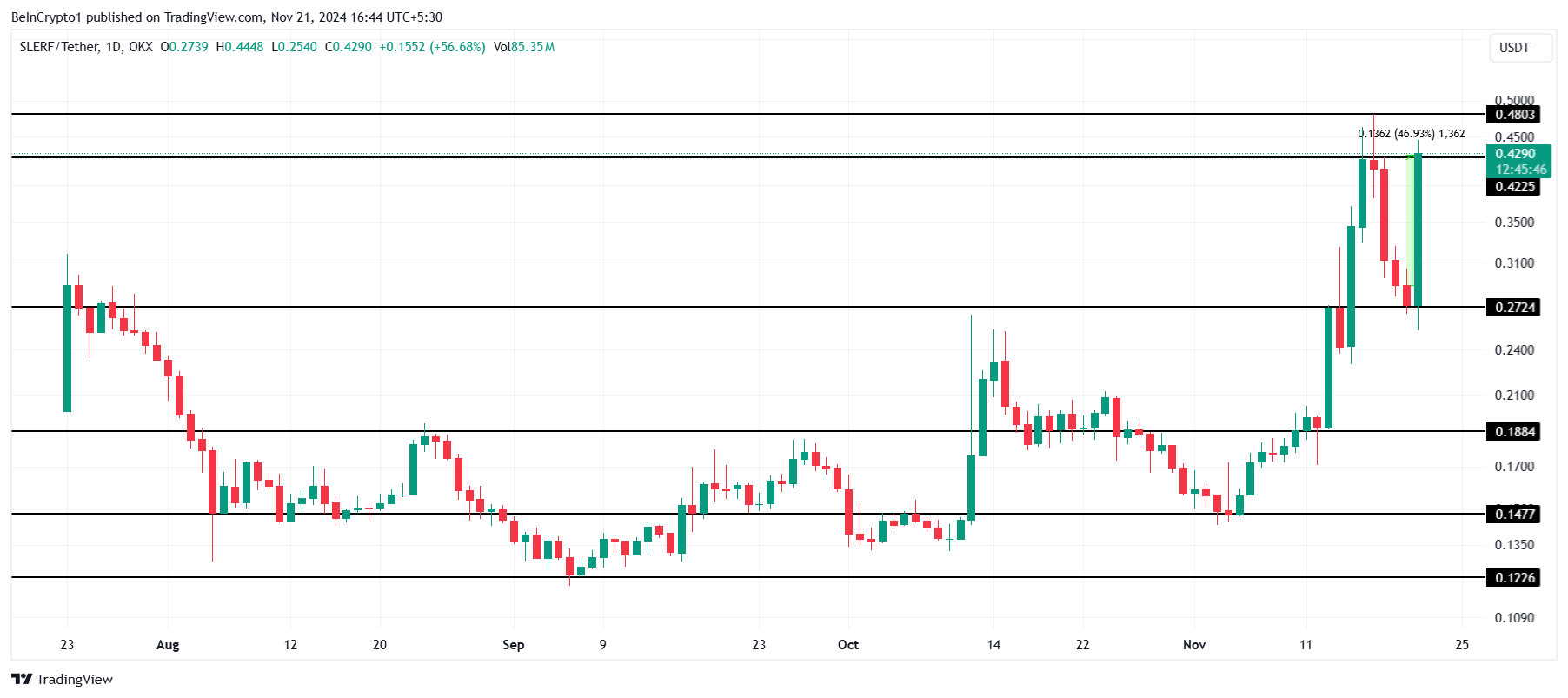 För att upprätthålla detta rally måste SLERF omvandla 0,422 USD till en stark stödnivå. Att uppnå detta skulle göra det möjligt för token att bryta 0,480 USD motståndsnivån, vilket banar väg för en potentiell ökning mot 0,500 USD, och därmed ytterligare stärka dess senaste vinster och attraktionskraft bland investerare.