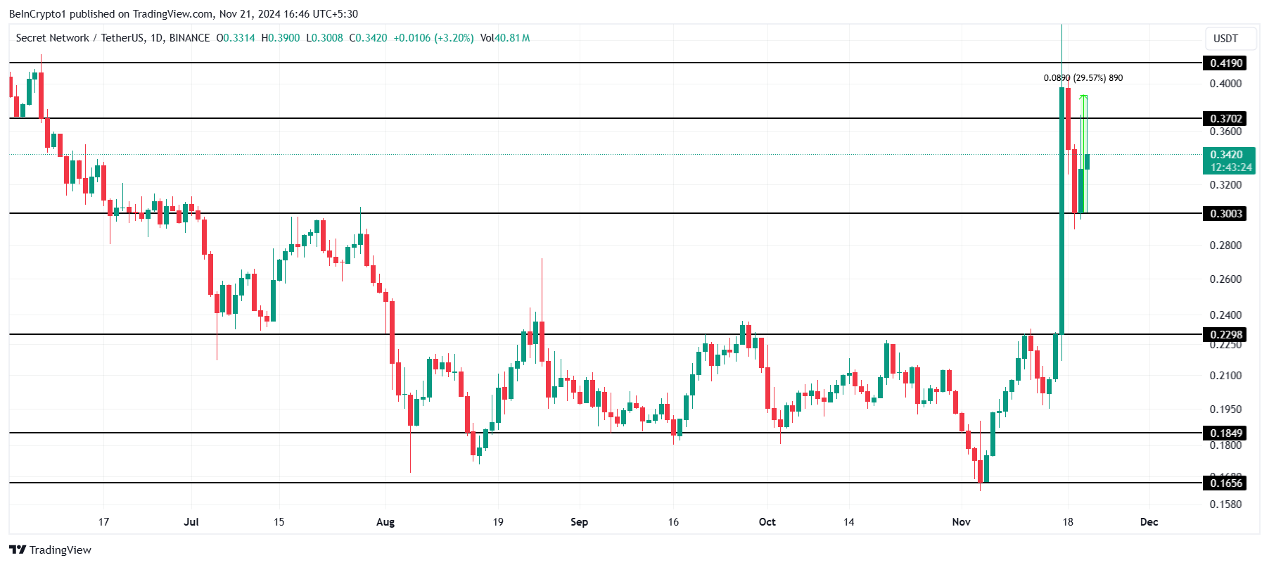SCRT:s pris ökade med 30 % under de senaste 24 timmarna, och nådde 0,41 USD innan det sjönk till 0,34 USD. Detta markerar en betydande återhämtning för altcoinet efter dess senaste korrigeringar, vilket signalerar förnyad positiv trend när investerare åter fokuserar på tillgången.