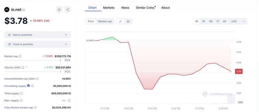 Denna notering markerar ett centralt ögonblick för io.net, eftersom token för närvarande handlas till 3.78 $. Den har en fullt utspädd värdering (FDV) på cirka 3 miljarder dollar. FDV är en produkt av tokenens nuvarande pris och dess maximala utbud.