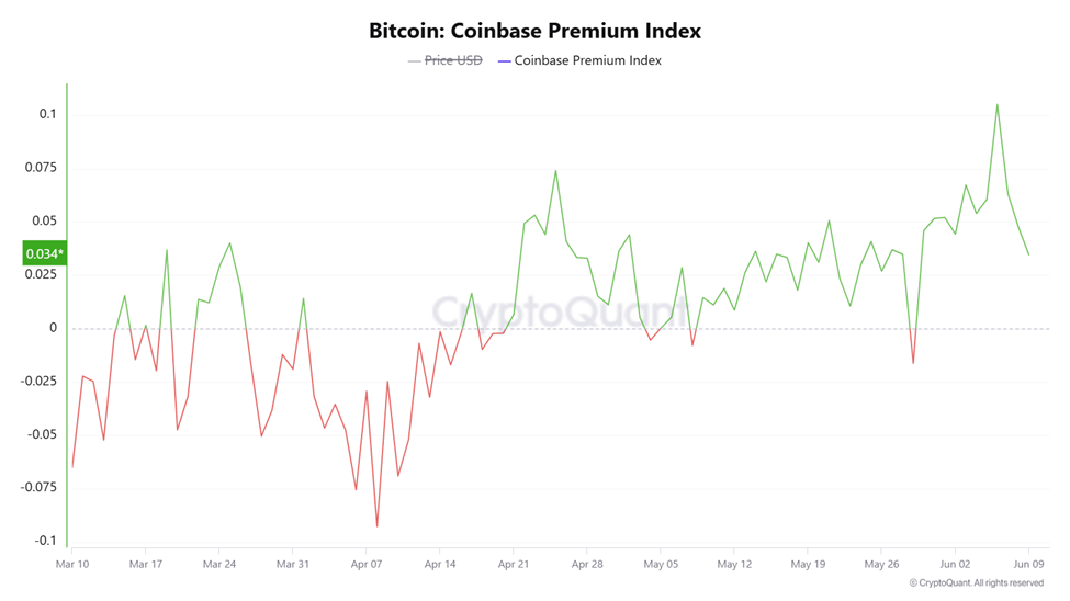 Detta diagram visar att Bitcoins Coinbase Premium Index för närvarande ligger på 0,034.