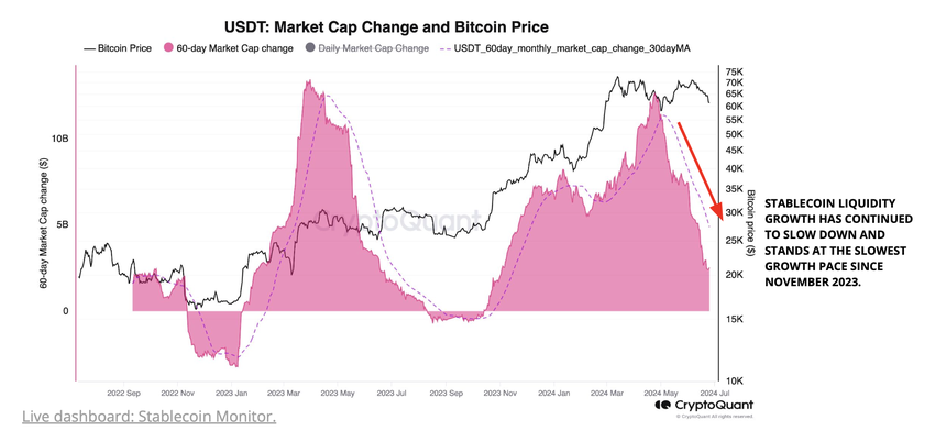 Tillväxten i Tethers USDT-börsvärde är en proxy för likviditeten på kryptovalutamarknaden. Efter att ha nått en topp på 12,6 miljarder dollar i slutet av april har tillväxten under de senaste 60 dagarna avtagit dramatiskt till bara 2,5 miljarder dollar, vilket är den långsammaste takten sedan november 2023.
