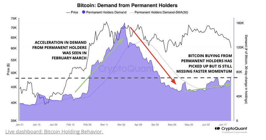 Det är viktigt att observera efterfrågan från permanenta innehavare för att avgöra om Bitcoin har bottnat. Permanenta innehavare köper nu i en takt av 72 000 Bitcoin per månad.