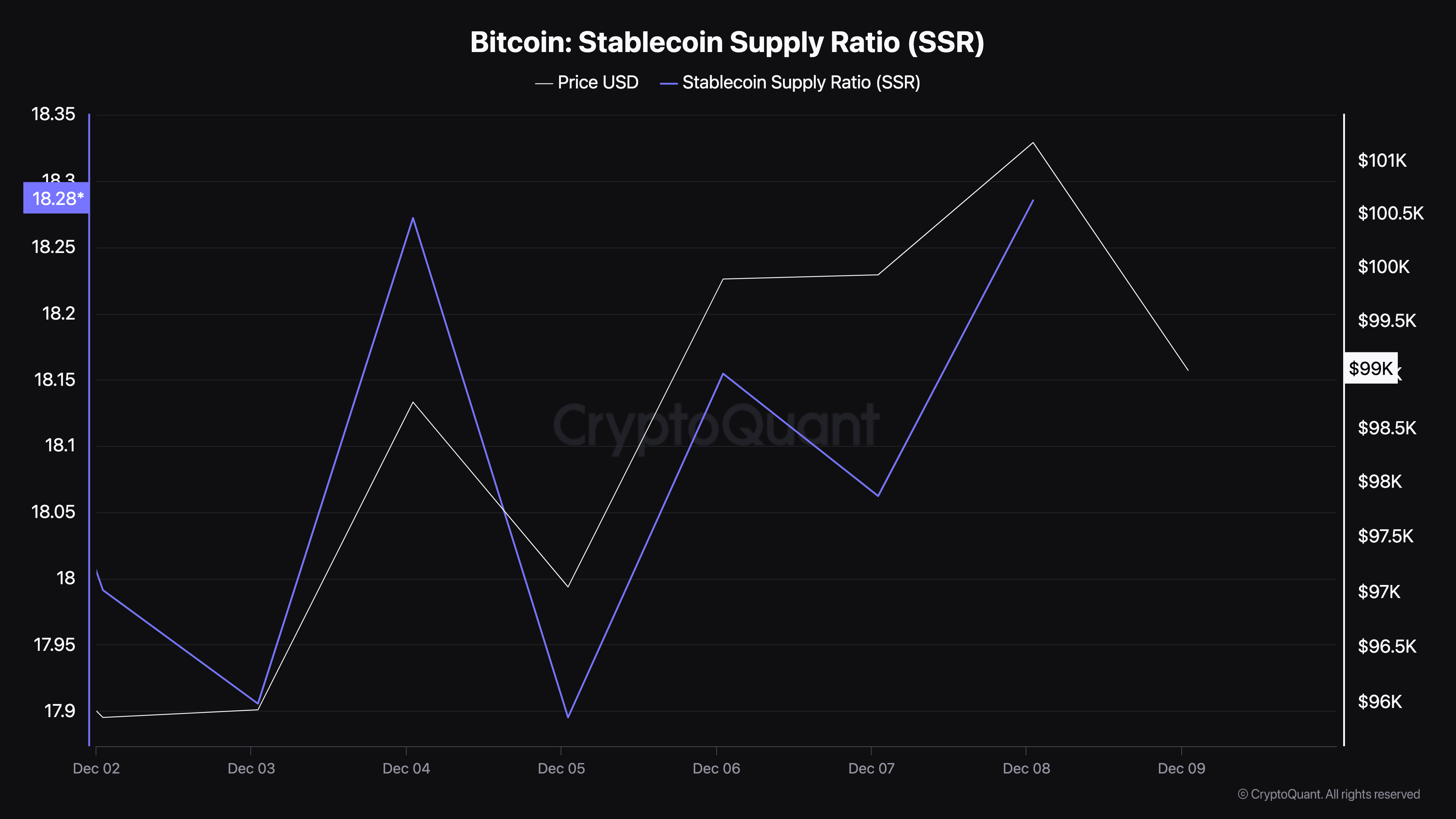 Enligt CryptoQuant har Bitcoin SSR stigit till 18,29. De ovan nämnda förhållandena indikerar att köpkraften inte längre är stark. Därmed kan Bitcoins pris fortsätta att handlas under sitt rekordhöga värde på 103 900 USD.