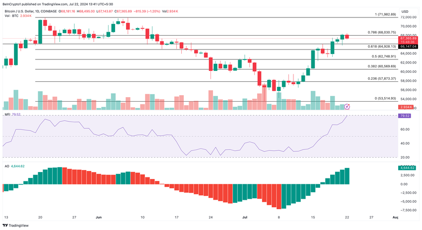 Om detta händer kan det bli svårt att nå $68 030. Awesome Oscillator (AO), som mäter momentum, är dock positiv. Positiva avläsningar indikerar ett ökande uppåtgående momentum, medan negativa tyder på något annat.