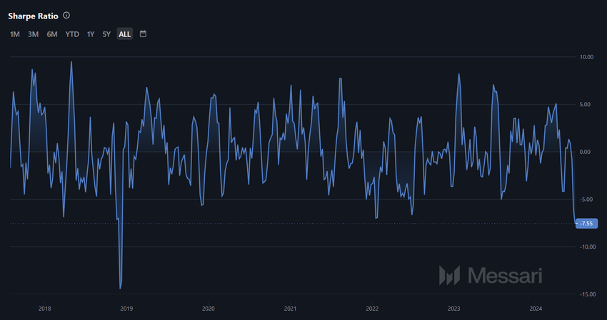 Dessutom har Bitcoin Cashs Sharpe-kvot nått den lägsta nivån på fem år på -7,55. Detta belyser dess minskade attraktionskraft som investeringsalternativ jämfört med andra tillgångar.