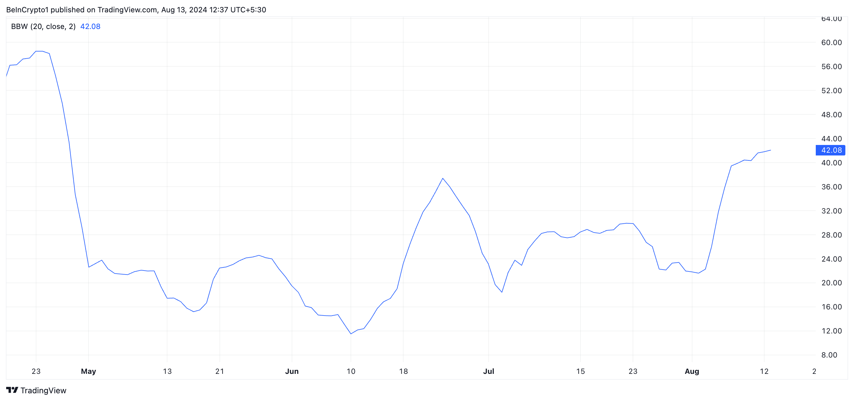 Vidare har BCH:s Bollinger Bandwidth, som hjälper handlare att mäta marknadens volatilitet och identifiera potentiella utbrottsmöjligheter, också ökat sedan den 5 augusti. När detta skrivs är BCH:s Bollinger Bandwidth-värde 42,08, efter att ha stigit med 32% under de senaste sju dagarna.