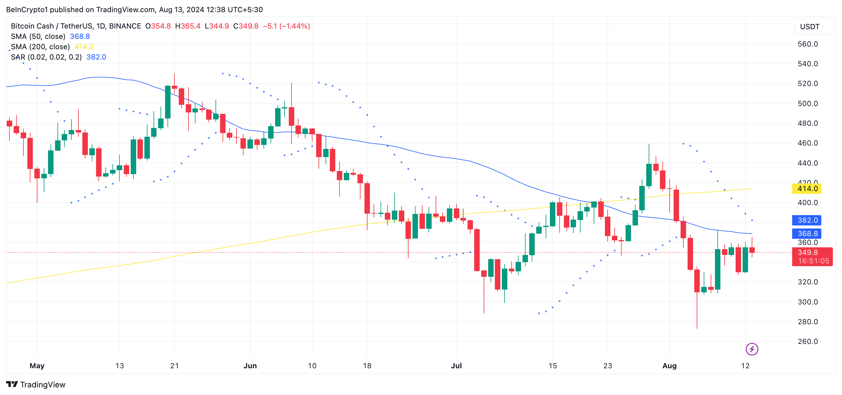 Dessutom fortsätter myntet att släpas efter av baisseartade känslor, vilket framgår av dess Parabolic Stop and Reverse (SAR) indikator. När detta skrivs ligger prickarna i denna indikator över BCH:s pris.